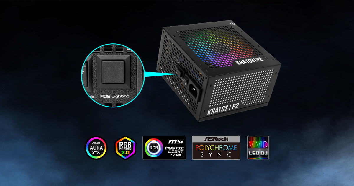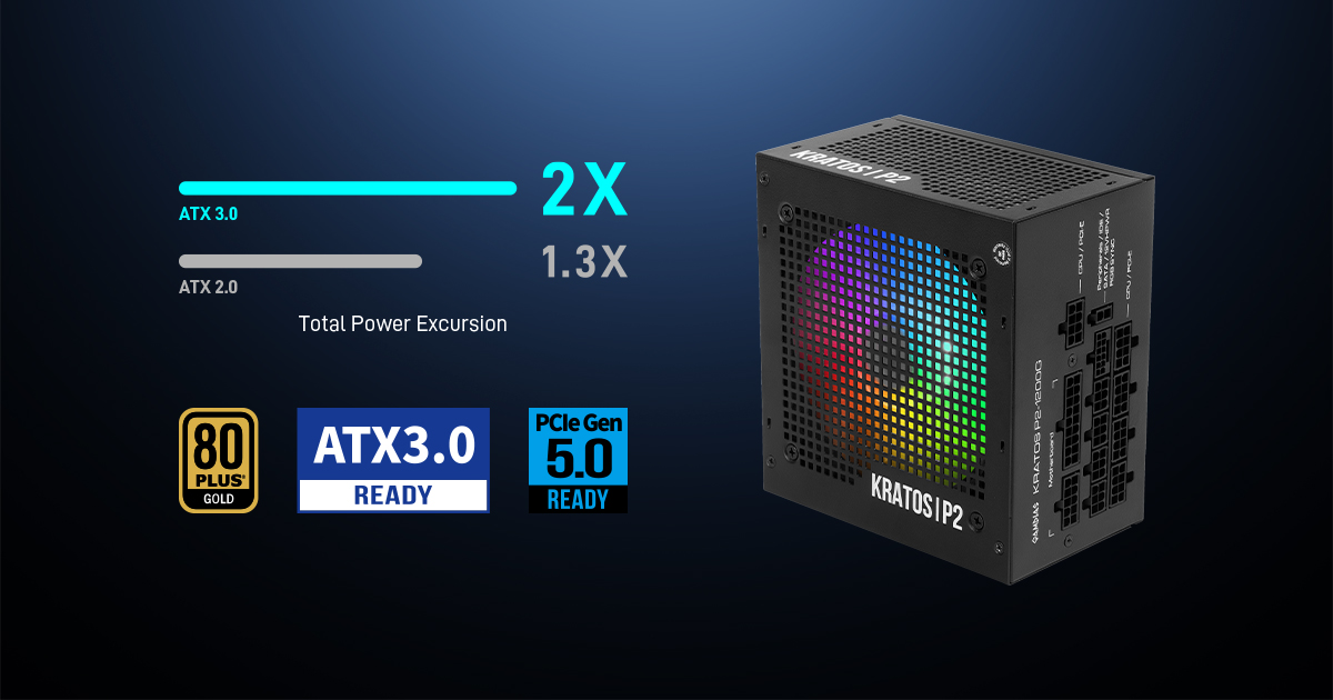 KRATOS P2 Series power supply units, available in 1200W, 1000W, 850W, and 750W. With 80 PLUS Gold certification, every of them guarantees stable and efficient performance. It supports up to 200% total power excursion to power up next-generation graphics cards and top-notch PC components. Furthermore, the PSU has 30 built-in ARGB lighting effects, making it stands out in both performance and aesthetics.